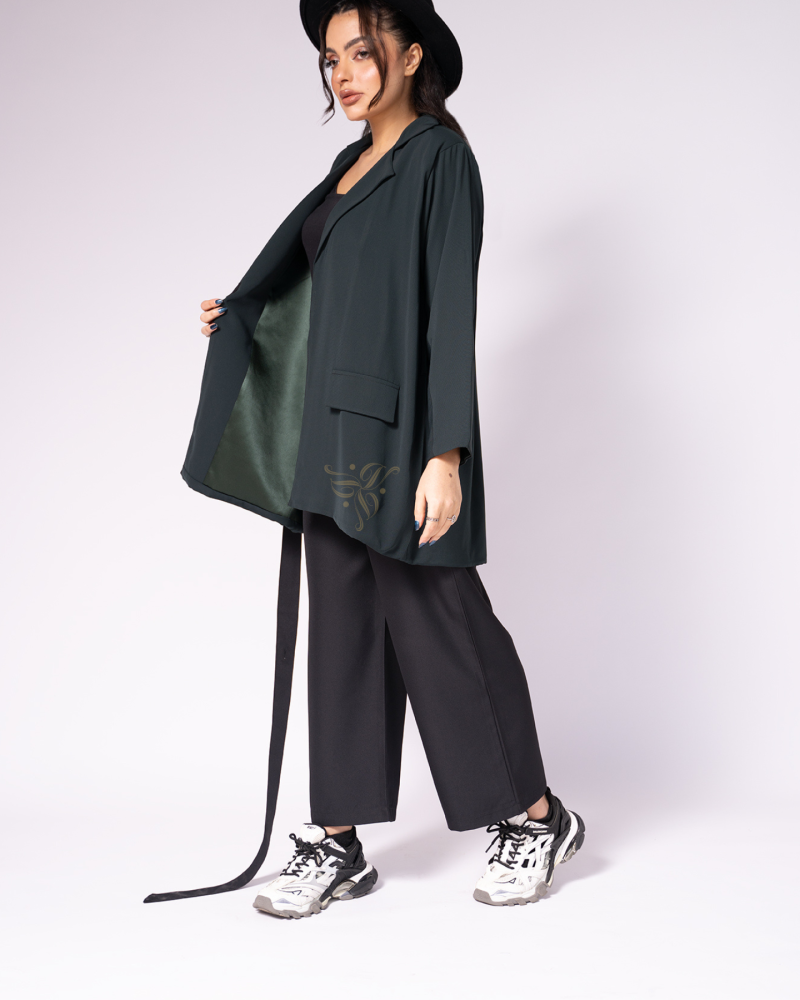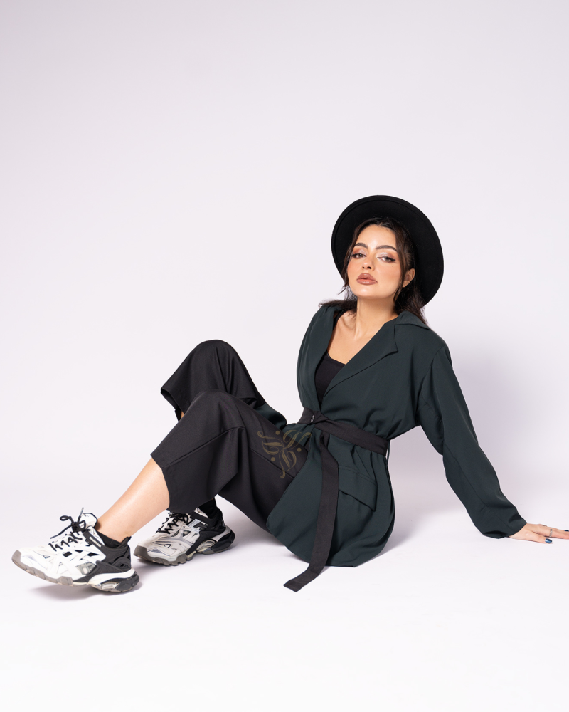 القطعة العلوية تتميز بقصتها الرسمية باللون الزيتي، يزيّنها وجود حزام متصل مع ازرار و جيوب شكلية.