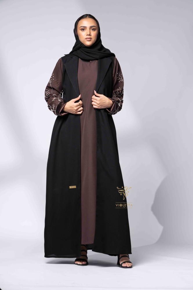 - عباية سوداء بتناغم جميل مع اللون البني في الأكمام وبفستان داخلي متصل.