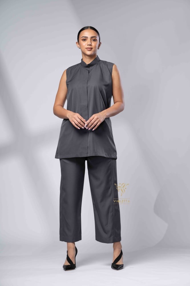 مكون من قميص بقصة ناعمة تشعرك براحة، و تبرز جمالك بطقطق مخفي بدون أكمام و بنطال واسع ب جيوب جانبية مخفية.