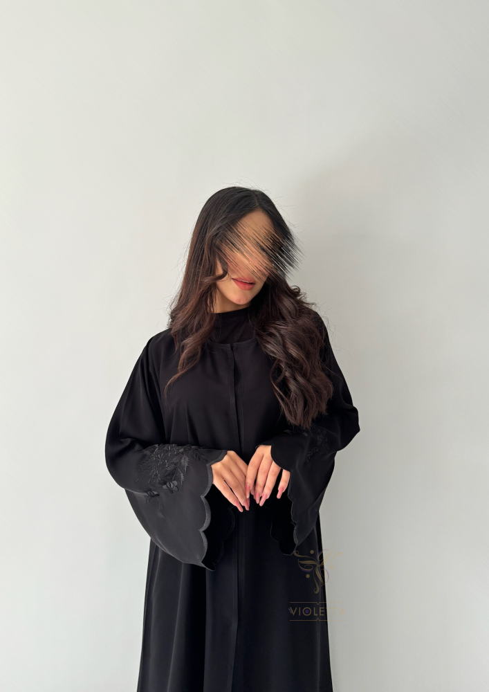 بأكمام مطرزة بالأسود لمجموعة متنوعة من الأزهار تنتهي بقصة الجرس واطراف صدفية دائرية التي تُضفي على العباية جمالًا فوق جمال.