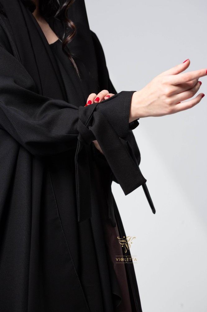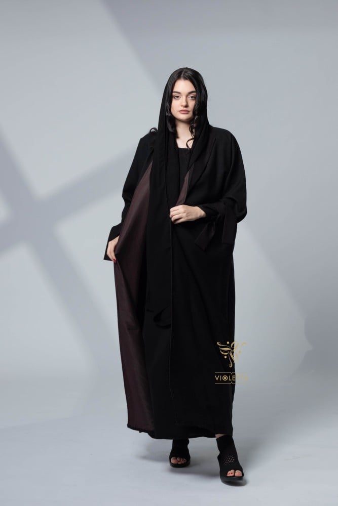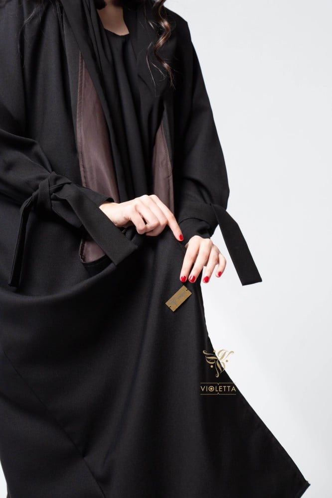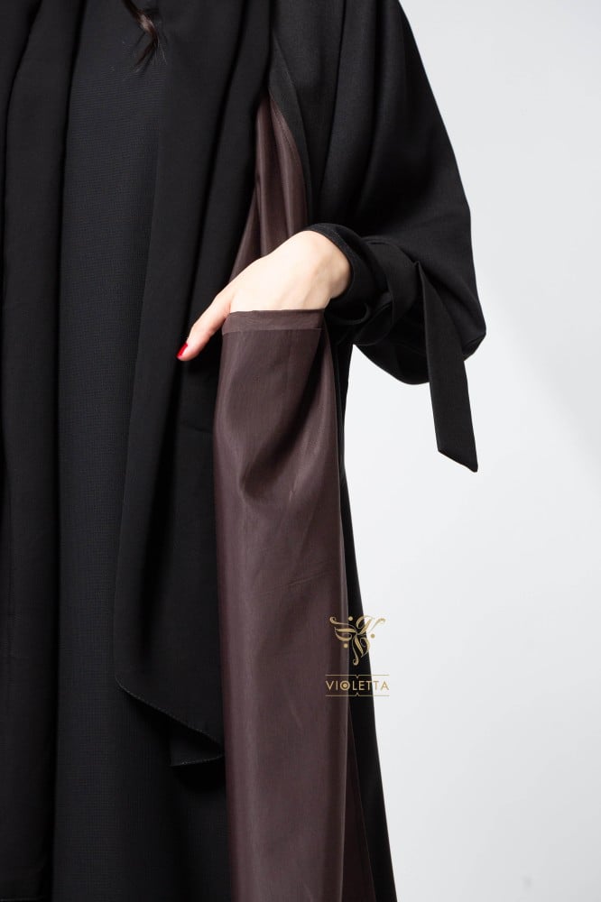 عباية لون بني من كولكشن سكاكر من فيوليتا ، تتميز بتصميمها الأنيق وخامتها الرائعة تحتوي داخليا على جيب مخفي ، العباية سوداء بالكامل مبطنة من الداخل بقماش حريري وتتميز بتفاصيلها الأنيقة بالأكمام الواسعة المزينة بربطة أنيقة بالأكمام