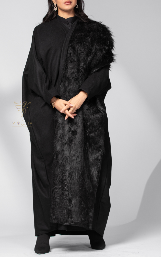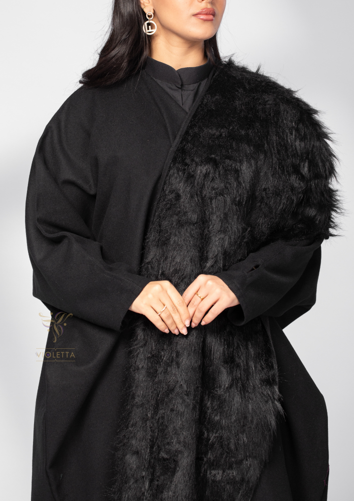 هذه العباية مصنوعة من قماش الجوخ ثقيل الوزن ومزينة بتفاصيل من الفرو الفاخر على خط العنق.