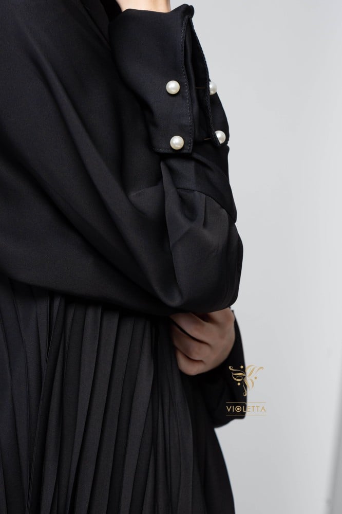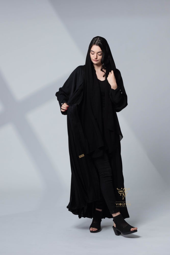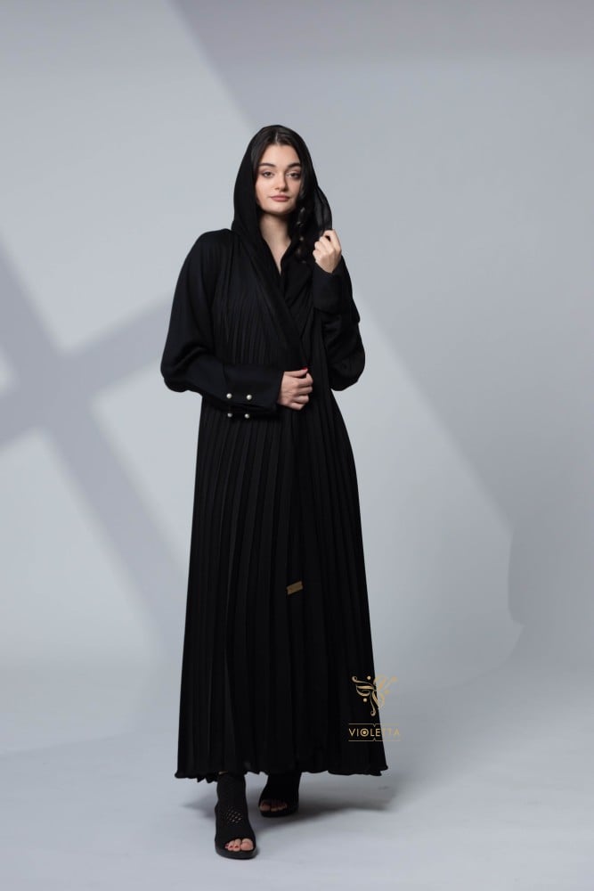 عباية سوداء أنيقة بكسرات (ثنيات) بطول العباية، تمنحك إطلالة مختلفة ومميزة بتصميم أنيق يمنحك الخفة والراحة، مصنوعة من قماش منساب يمنحك شعور الحيوية والجمال تساعدك على تمييز إطلالتك أينما ذهبتِ، كما أن أكمامها أنيقة مزينة بمشابك من اللؤلؤ المميز والتي أضفت بوجودها جمالًا مختلفًا على تصميم العباية.