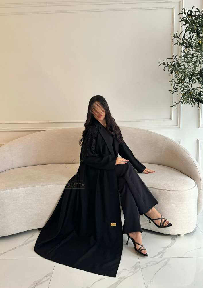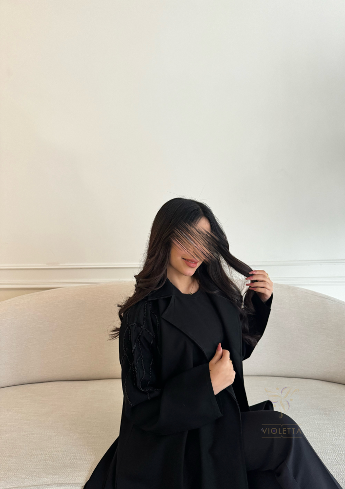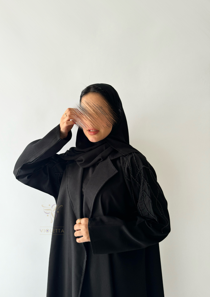 • عباية مطرزة بشك خرزي برسمة اغصان من الاكتاف وعلى الأكمام، لتبرز أناقتك.